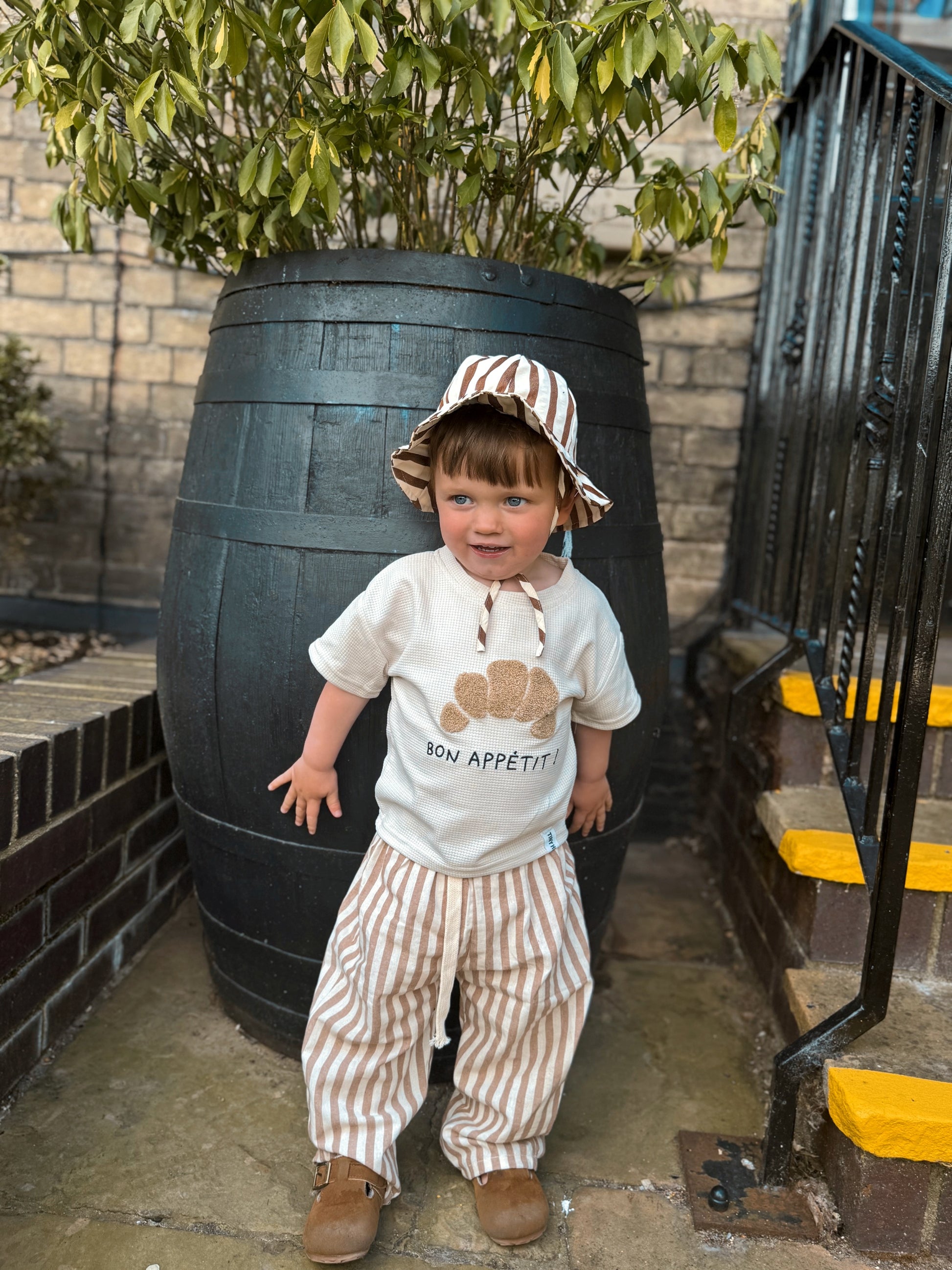 A gorgeous classic shape bucket hat, with elasticated brim for extra comfort and tie detailing. The perfect finishing touch to any summer outfit.